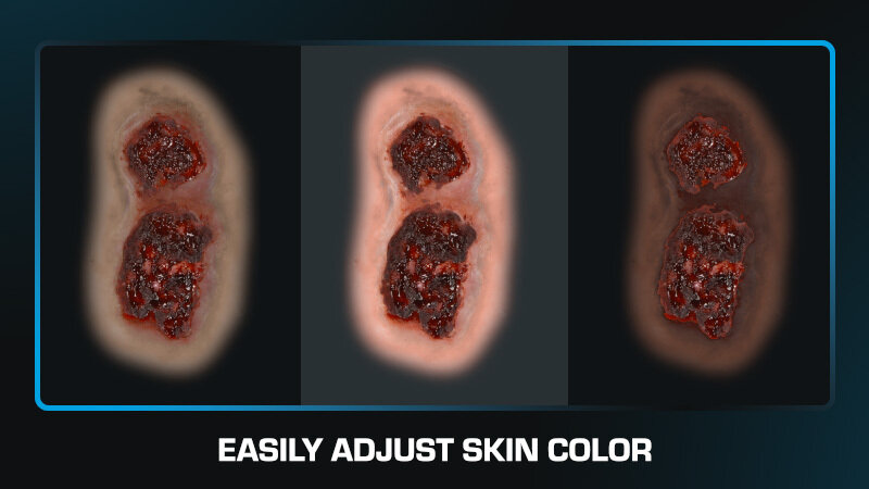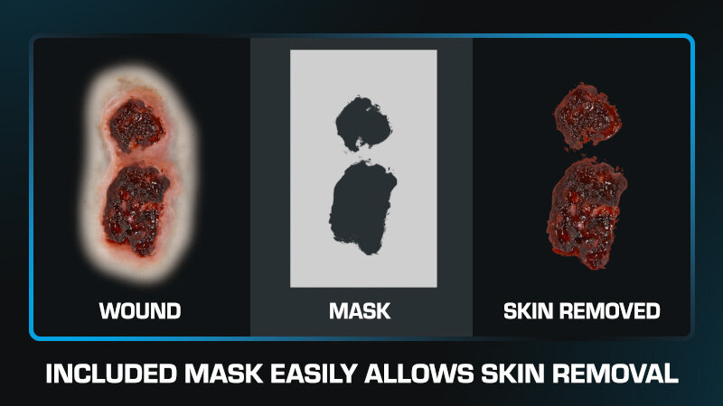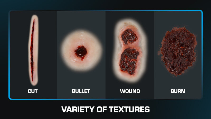 Gore Textures Vol. 2 offers 83 high-quality wound textures designed to add realistic wounds to actors and characters. These textures, which include bullet wounds, cuts, burns, and various other injuries, were created using real prosthetic wounds by a... More
